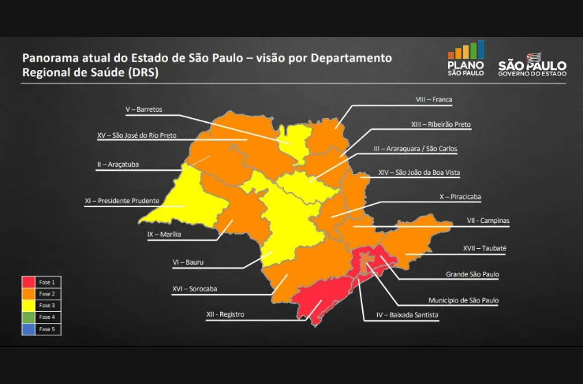 As regiões da fase 3, de “flexibilização”, devem estar operando com menos de 60% de ocupação dos leitos de UTI específicas para Covid. Nessas localidades estão liberadas, desde que respeitem os protocolos sanitários e de distanciamento social, atividades imobiliárias, concessionárias, escritórios, indústria e construção civil.