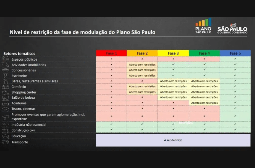 O projeto de retomada da economia, intitulado de “Plano São Paulo”, terá cinco etapas e vai seguir diretrizes criadas pela Secretaria de Saúde, o Comitê de Contingência para Covid, representantes das 16 regiões administrativas de São Paulo e grupos de empresários.